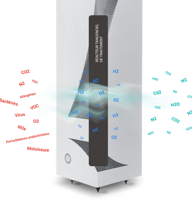 Ce « craquage moléculaire » des polluants chimiques et des contaminants de l’air permet ainsi de ne laisser dans l’atmosphère que ces éléments d’origine : O2, CO2, H2O, N2.